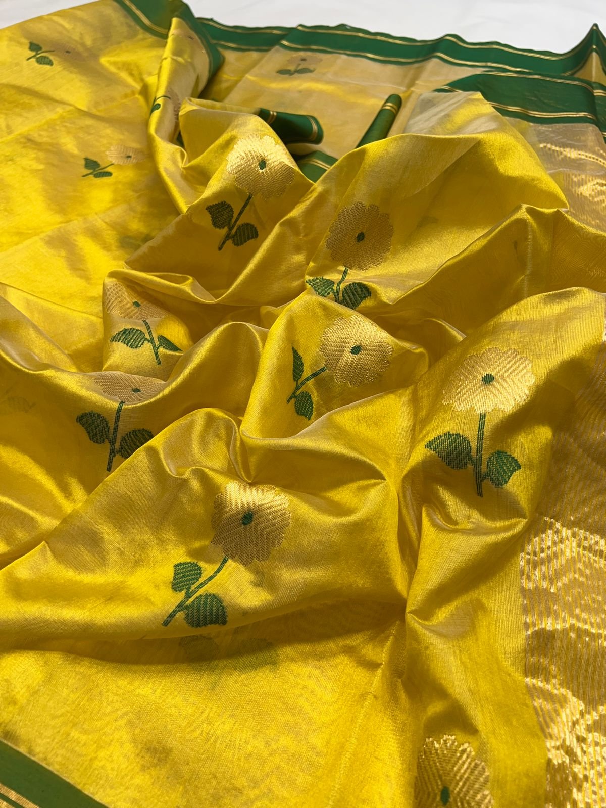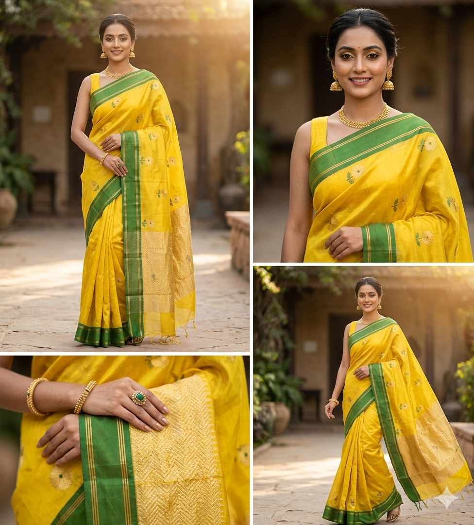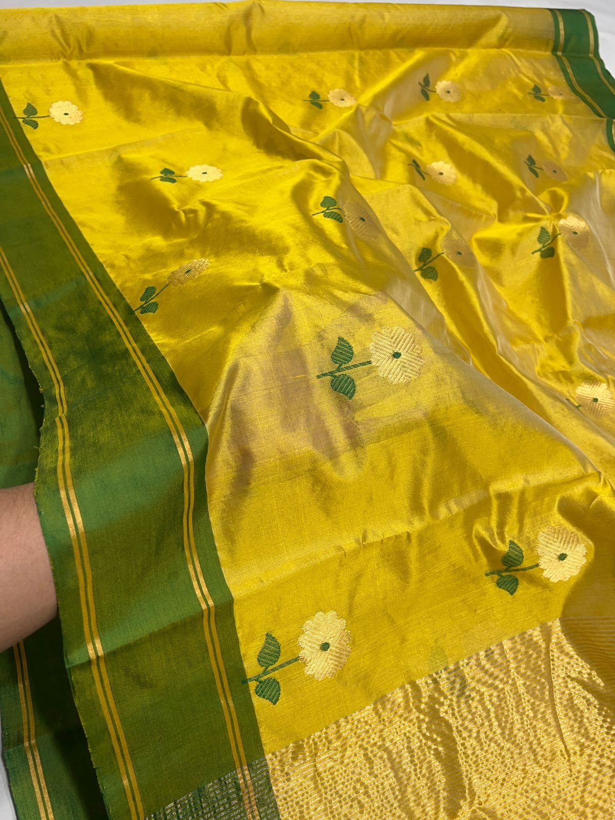 ​Product Name: Golden Sunshine Chanderi Silk Saree with Emerald Borders