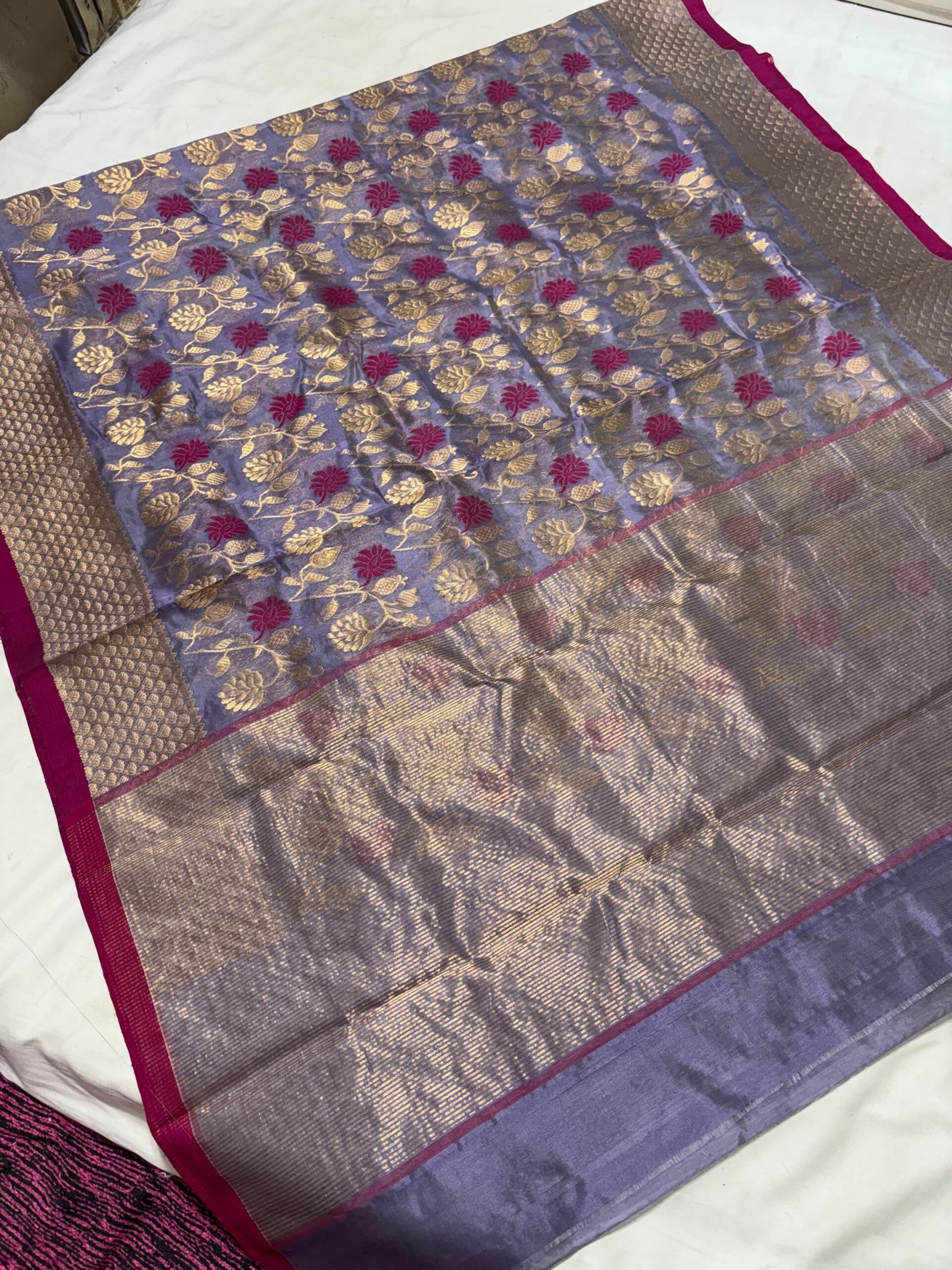 ​Design: Intricate floral butis in gold zari and pink silk thread woven across the entire body.