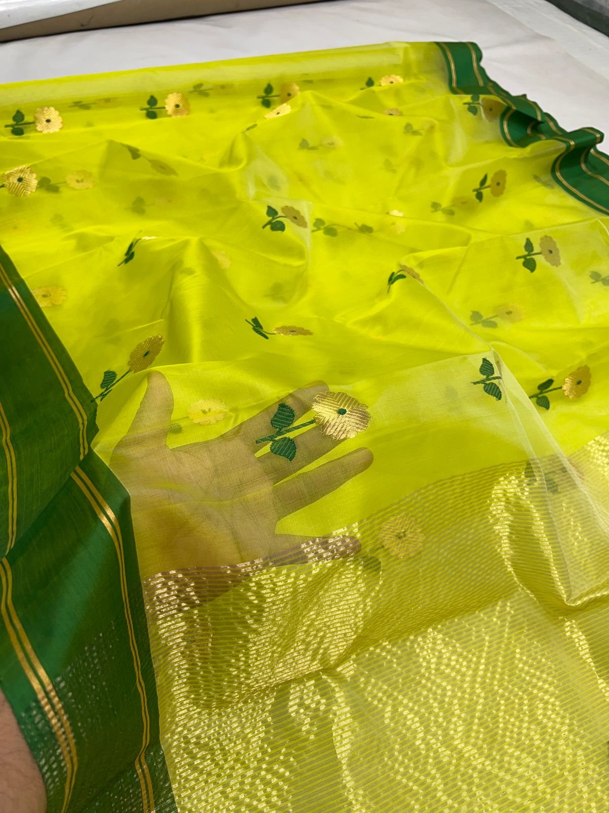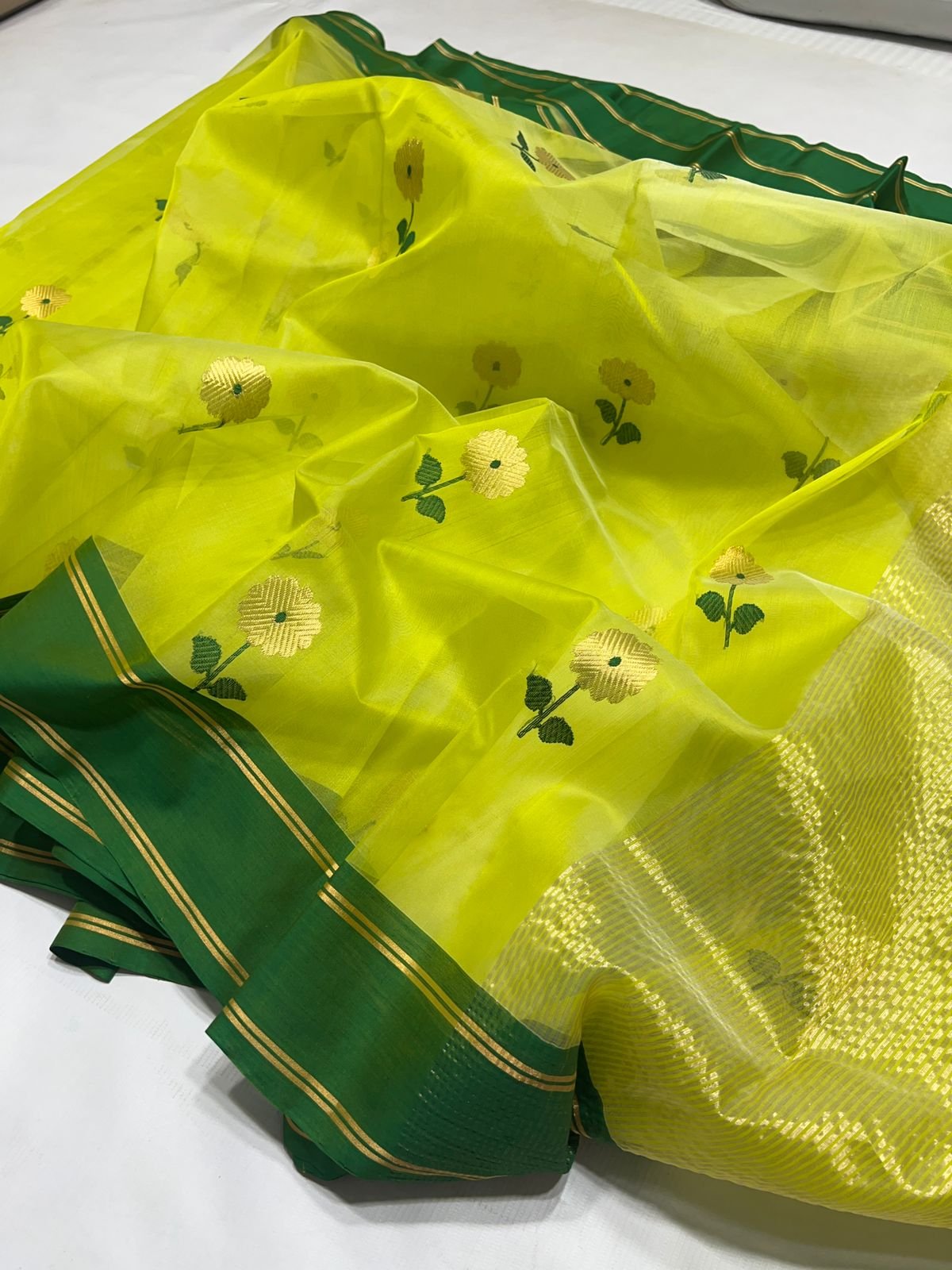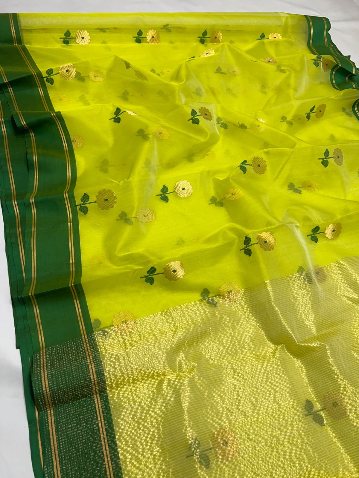 ​The saree features a luminous yellow hue adorned with delicate hand-woven floral buttis. Each motif consists of a golden zari flower with a contrasting green stem, distributed evenly across the fabric to provide a balanced, sophisticated look.
