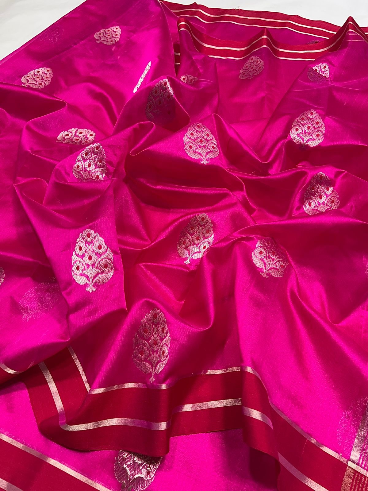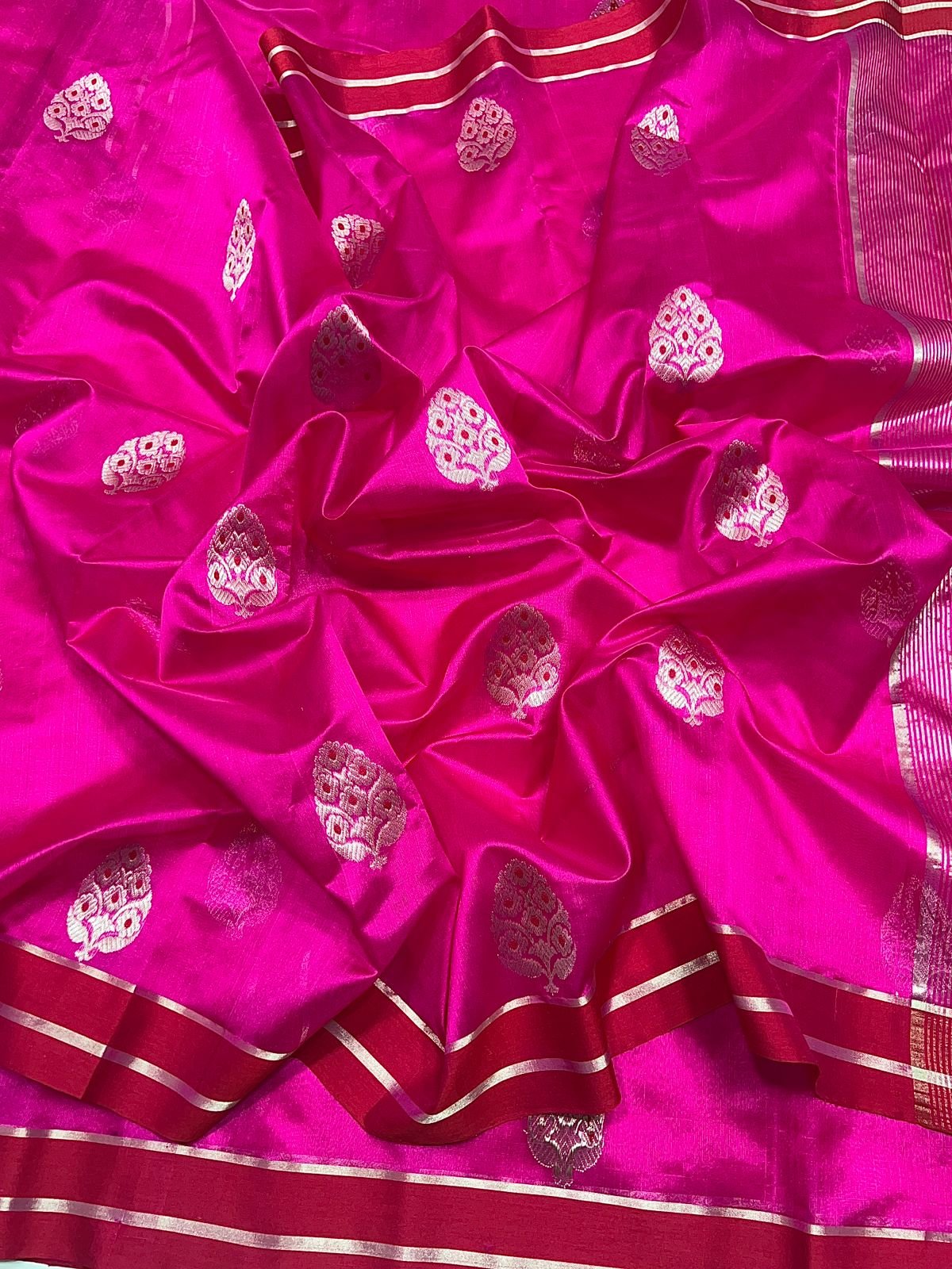 ​Body: Features a striking magenta (Rani Pink) hue, adorned with intricate silver zari buttas in a traditional floral-leaf motif, spaced elegantly across the fabric.